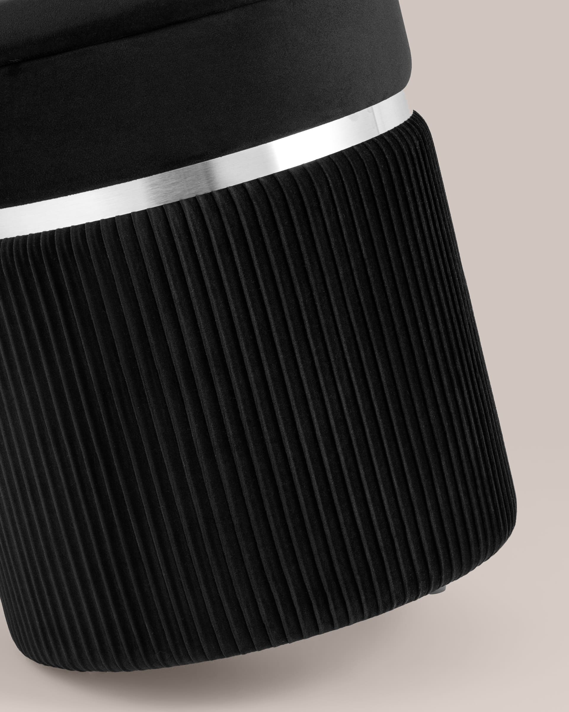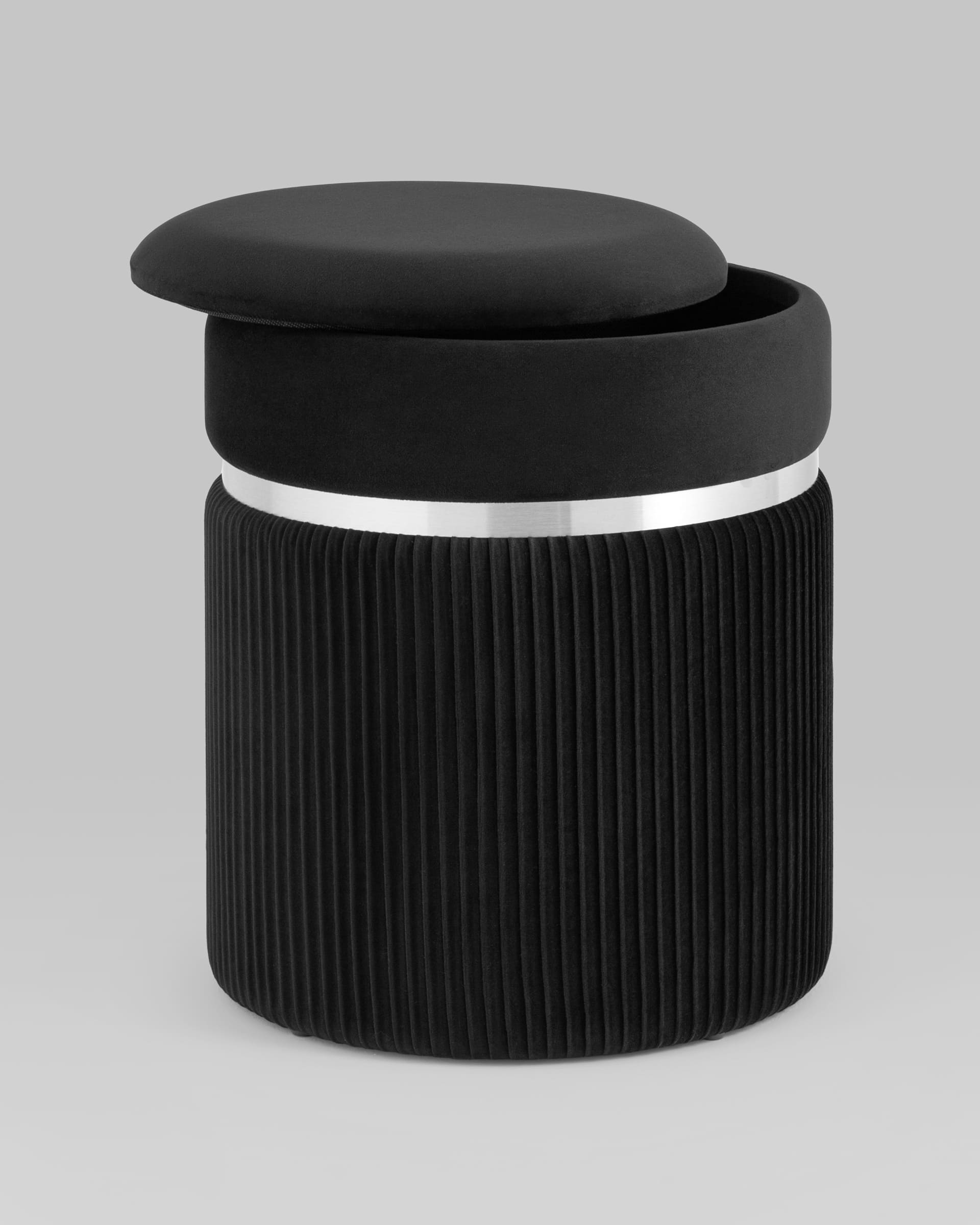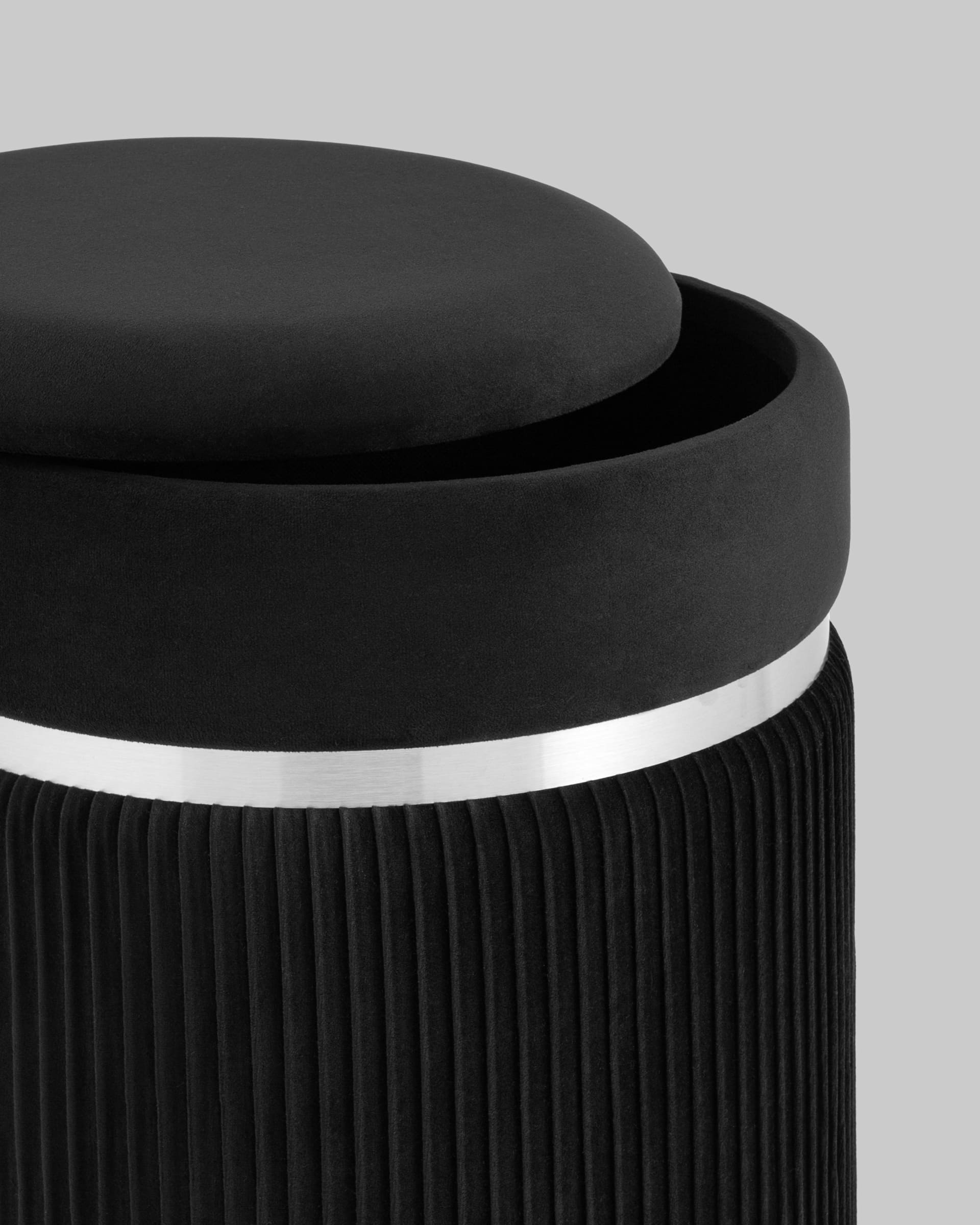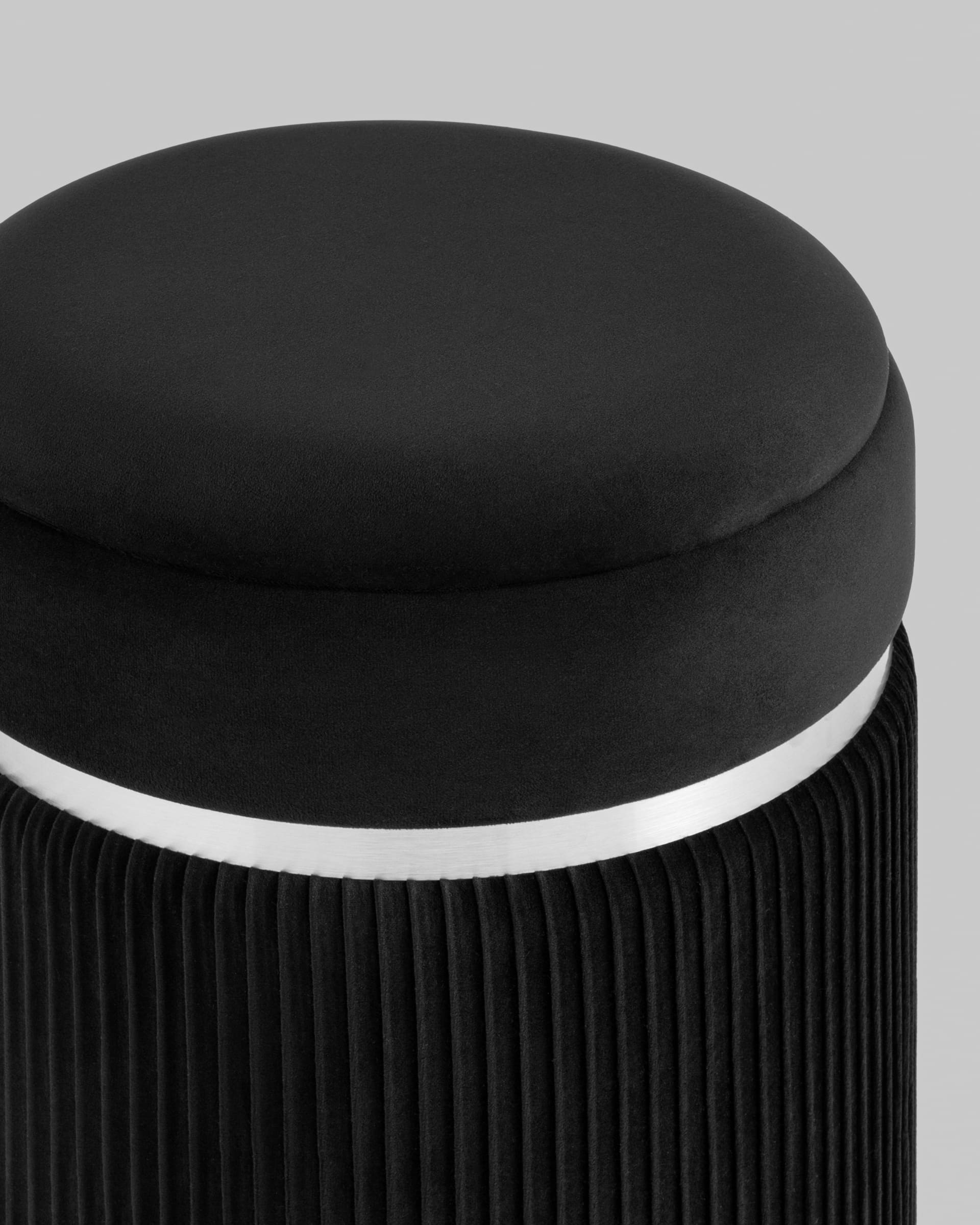 Пуф Миранда с ящиком серебро велюр черный с декоративным серебряным ободком