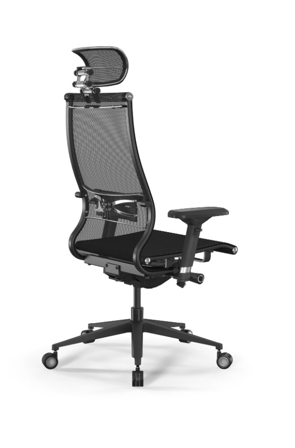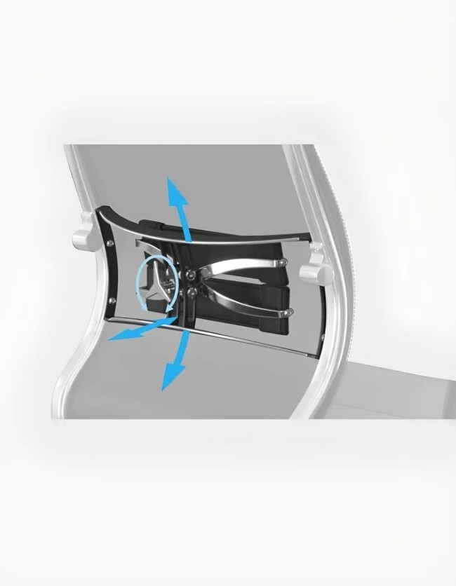 Спинка кресла имеет уникальную эргономичную форму, повторяя анатомические изгибы тела и поддерживая правильную осанку. Дополнительная поддержка обеспечивается благодаря встроенному 3D поясничному подпору, регулируемому по высоте, глубине и жесткости.